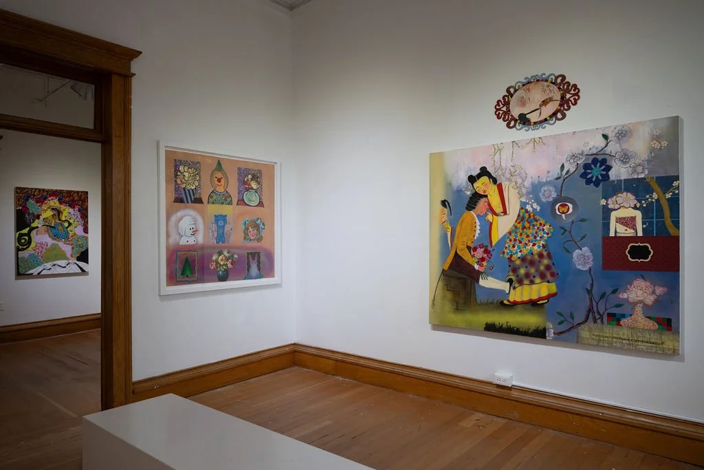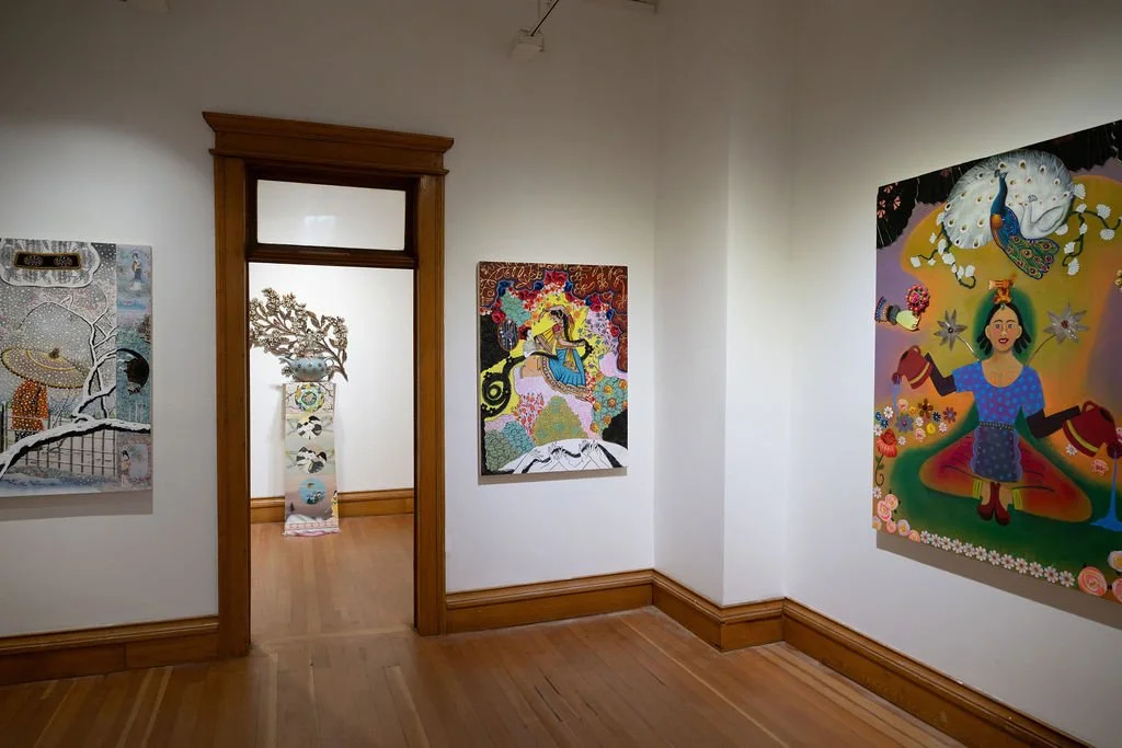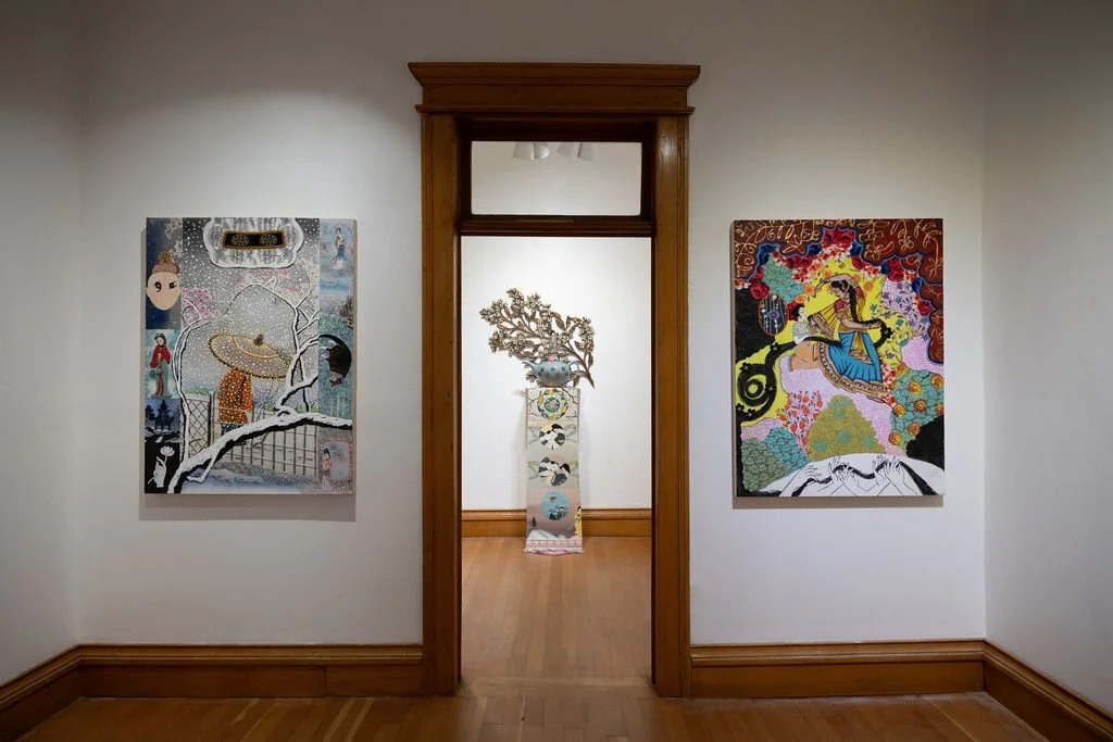 Chicago-based Phyllis Bramson creates richly ornamental, excessive, and decadent paintings. She is greatly inspired by 18th–century Rococo and Chinoiserie, along with Chinese Pleasure Garden paintings and the French painters Boucher and Fragonard. The narratives in Bramson’s paintings remain incomplete, telling an open-ended story and resembling tropes concerning romantic folly. Her canvases are used as a repository for feelings, which often collide and intermingle between the personal and a grander narrative.